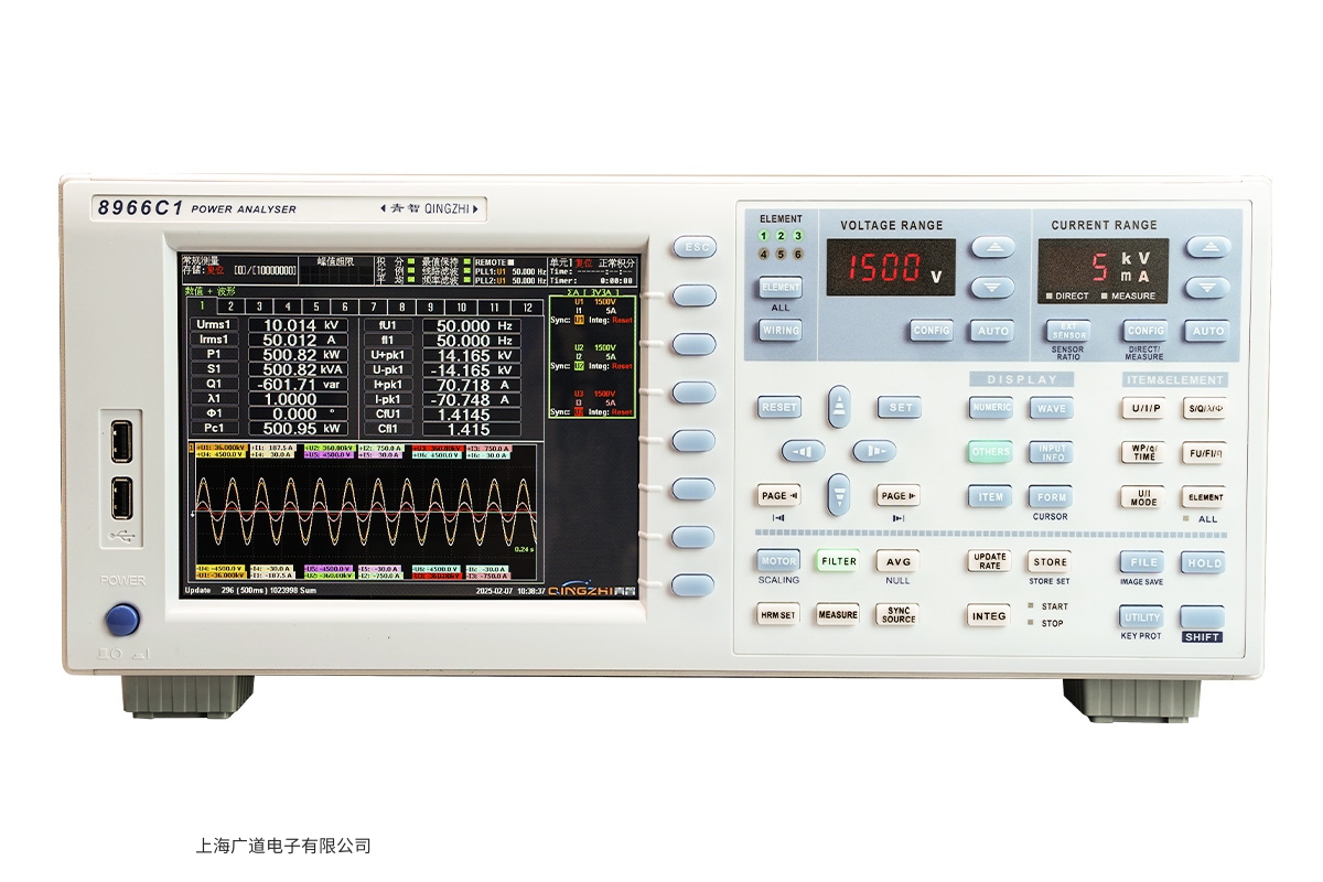 产品特点: 1、1-8 通道自由选配,可扩展电机专用接口,多模式,多量程选择,灵活自由;2、 基本精度 ±(读数 0.01% + 量程 0.04%);3、应用 FPGA+ARM 处理器,16 位 AD 芯片 6 通道电压、电流同时采样;4、 带宽 2MHz、DC。采样速率 2M/s;5、 数据更新周期自由可调(50ms、100ms、200ms、500ms、1s、2s、5s、10s、20s);6、电压量程 1500V、电流量程 5A 或 50A 各 8 个档位切换,测试功率范围更宽; 7、支持外部传感器接入,自由扩大电压、电流的测试范围;8、 内部存储,且支持外部 USB 存储器扩展,可实现便捷的数据存储、转存。9、 1-500 次谐波测试;并可增加间谐波测试功能;10、多模滤波。线路滤波 1KHz、100-100kHz 截止可调;频率滤波 1KHz、100Hz-100kHz 截止可调;11、 8 英寸彩色触摸屏,操作更便捷。12、 通讯接口丰富,标配 USB、RS485、RS232、以太网口。